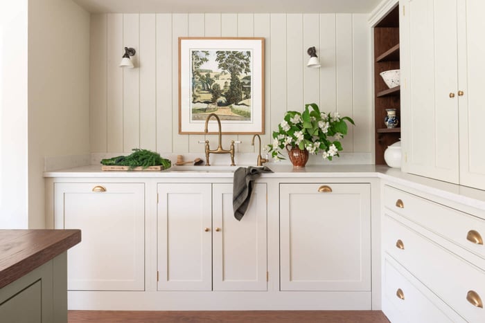 • And aged brass Perrin and Rowe taps to complete the timeless look in this custom kitchen design. The smaller tap is the mini-instant hot water tap.