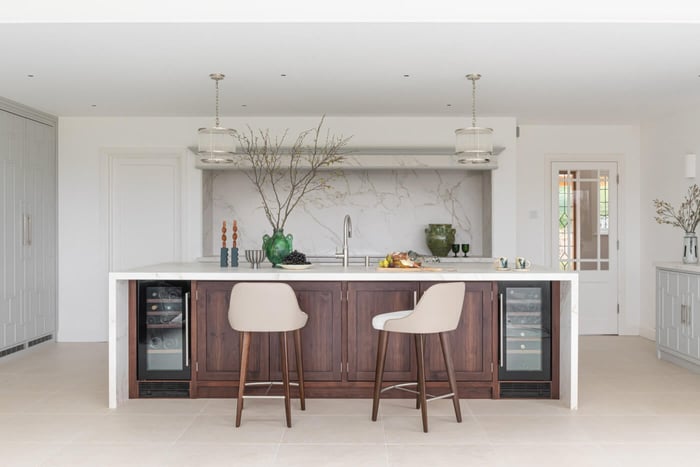 The walnut kitchen island is the focal point of the open plan room, and not only serves as a visual centerpiece but also boasts a functional design. Two wine coolers, seamlessly integrated into the island, not only contribute to the symmetrical aesthetics but also ensure that your red and white wines are stored at their optimal temperatures. It's a thoughtful touch that adds both practicality and finesse to the overall design. The dishwasher, bins and sink are all centrally located here on the island too, so everything is within reach. Not to mention that the countertop provides oodles of food prep space, and breakfast bar ready with sleek Roche Bobois Eden-Rock bar stools.